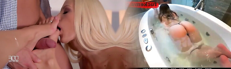 Busty brunette foot fetish and footjob in nylons