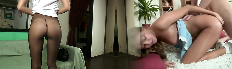 Handsome Russian teen babe on the couch poses in black nylon pantyhose