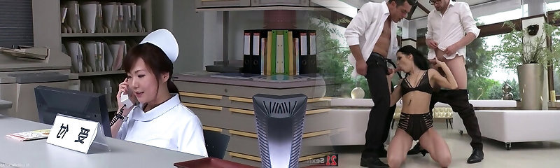 Beautiful sex addicted brunette nurse having bi-racial threesome
