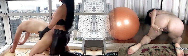 Sexy brunette lesbian riding a hefty strapon